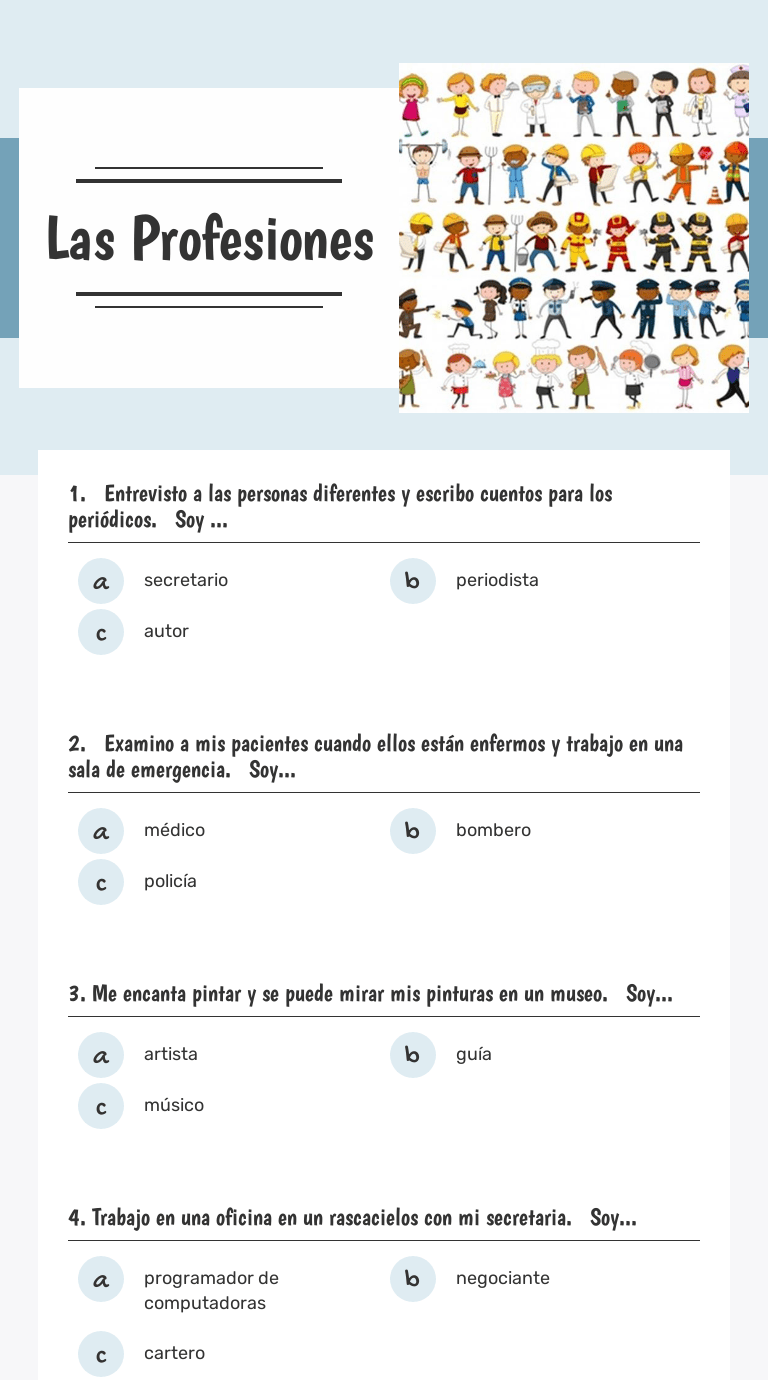 Browse las profesiones resources on teachers pay teachers, a marketplace trusted by millions of teachers for original educational . Los artculos definidos y las preposiciones . Worksheet spanish definite articles profession articulos definidos profesiones. Make a worksheet · browse worksheets. Digital worksheets from franlaff.com each feature blue fields to mark . Las profesiones · terms in this set (35) · practice workbook 3 · ¡qué chévere! Connect to a spanish unit on careers; A memorizar el vocabulario sobre los trabajos y profesiones más comunes en español. Ser vs estar worksheet answers together with ser and estar. Level 1 workbook · ¡qué chévere! Preguntar y hablar sobre las profesiones y ocupaciones. Occupations in spanish (las profesiones). Level 2 · asi se dice!